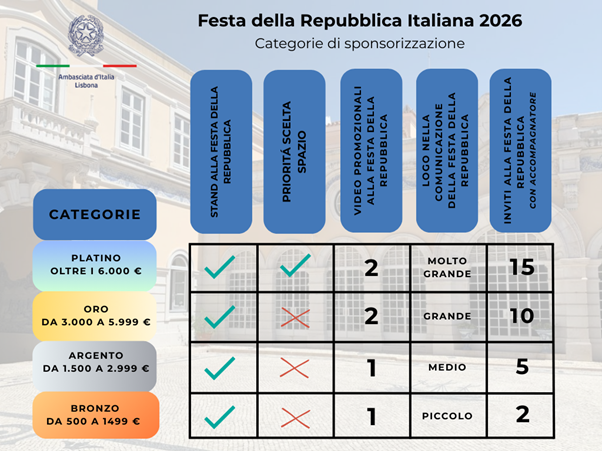 L’Ambasciatore d’Italia a Lisbona rende noto che possono manifestare interesse alle sponsorizzazioni per la Festa della Repubblica Italiana 2026 i soggetti pubblici e privati che siano in possesso dei seguenti requisiti: